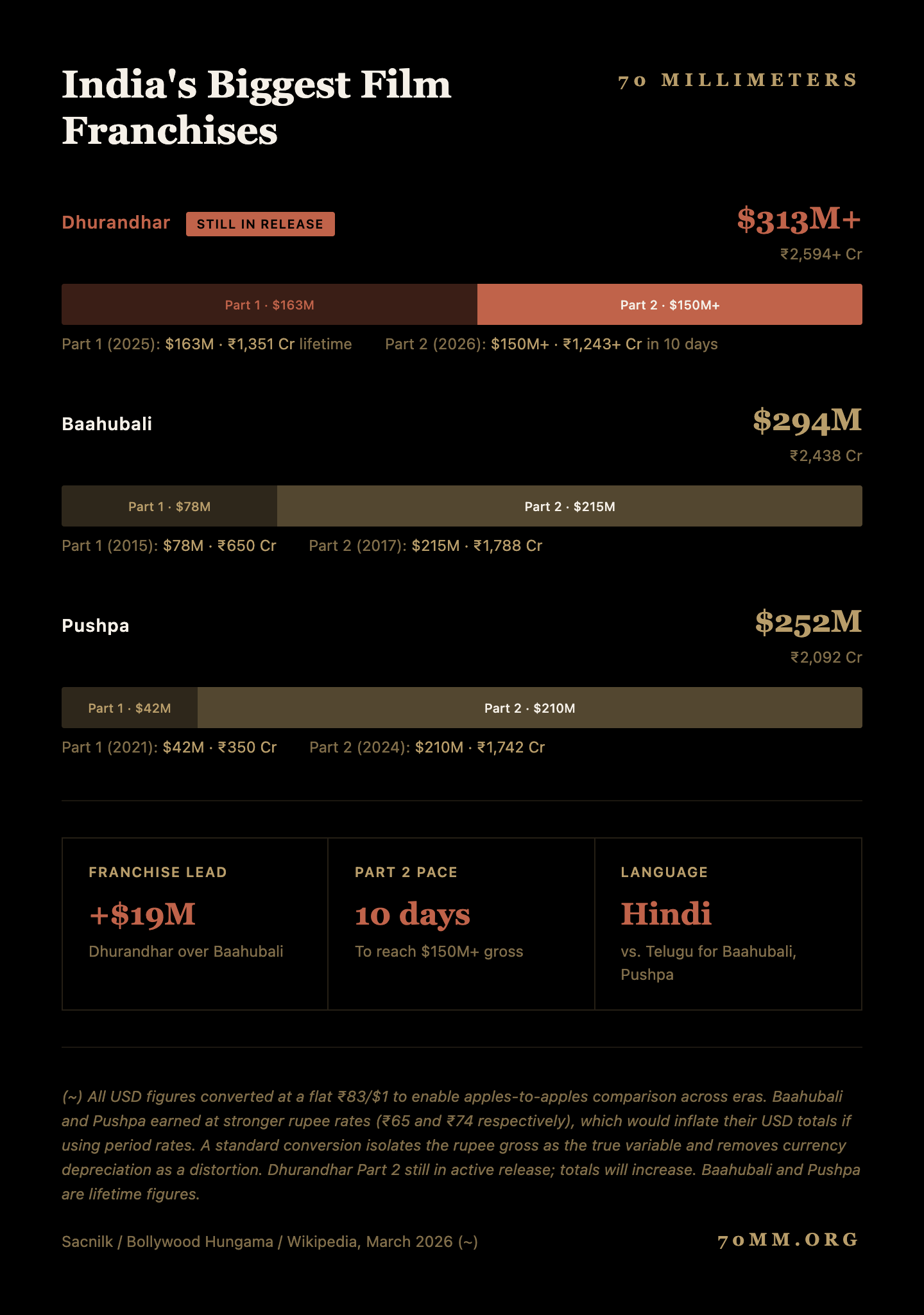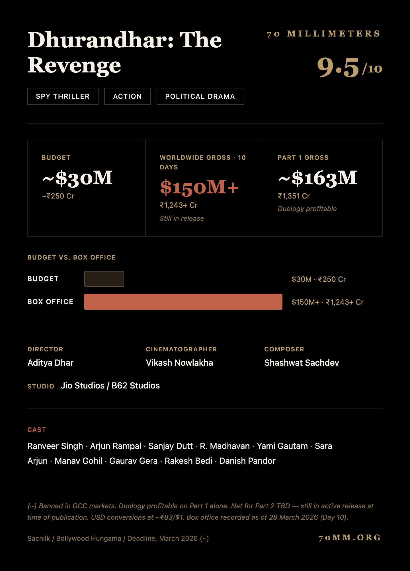 The record-breaking opening is no coincidence. Dhurandhar: The Revenge set paid preview records, crossed ₹500 crore net in its first week, and is tracking toward the ₹1,000 crore club faster than any Hindi film in history. The franchise has now crossed ₹2,200 crore worldwide, behind only the Baahubali and YRF Spy Universe franchises. If it has even half the legs of the first film, this becomes the greatest Indian movie franchise of all time. The numbers are the sound of an audience that was starving for a cinema that takes their reality seriously and gives it back to them on the largest possible screen.