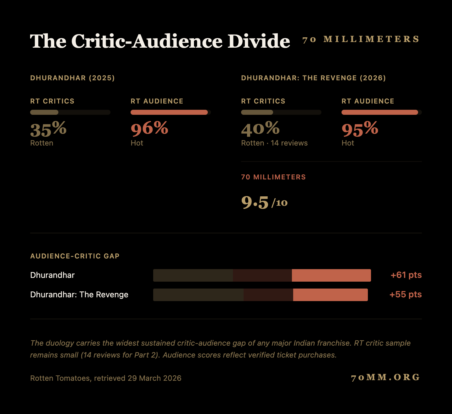 The numbers tell the story the critics won't. Dhurandhar Part 1 sits at 35% with critics on Rotten Tomatoes and 96% with audiences. Part 2: 40% critics, 95% audience. That's a 61-point gap on the first film and a 55-point gap on the second, the widest sustained critic-audience divide of any major Indian franchise. And the critic sample is laughable: 14 reviews for Part 2. Fourteen. Likely all handpicked for their ideological leanings. For a film that broke Indian box office records. The audience score reflects verified ticket purchases, people who actually sat in the theater for nearly four hours. The critics score reflects a handful of English-language outlets, many of whom decided the film was propaganda before the opening credits rolled. When the gap between professional critics and the paying public is that wide, that consistent, across two films, the question stops being "is this film good?" The question becomes "who are film critics actually writing for?" Because it clearly isn't the audience.