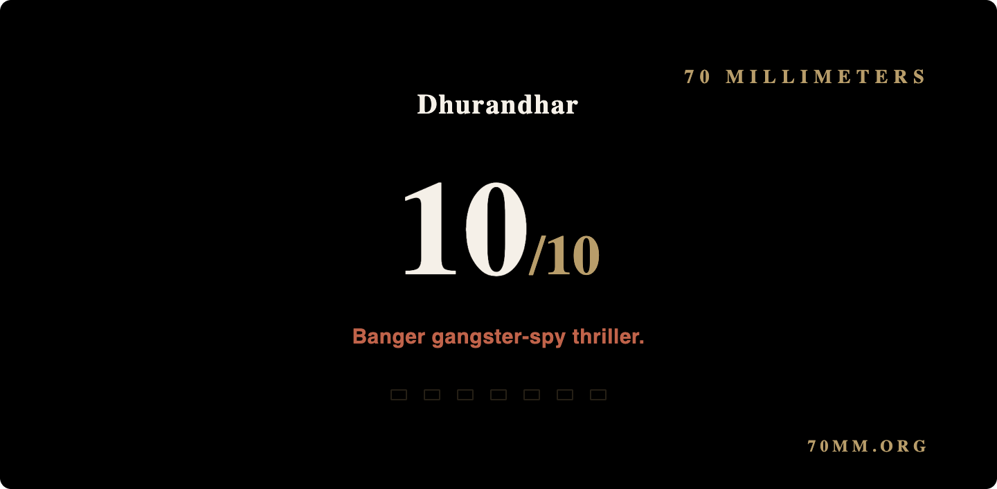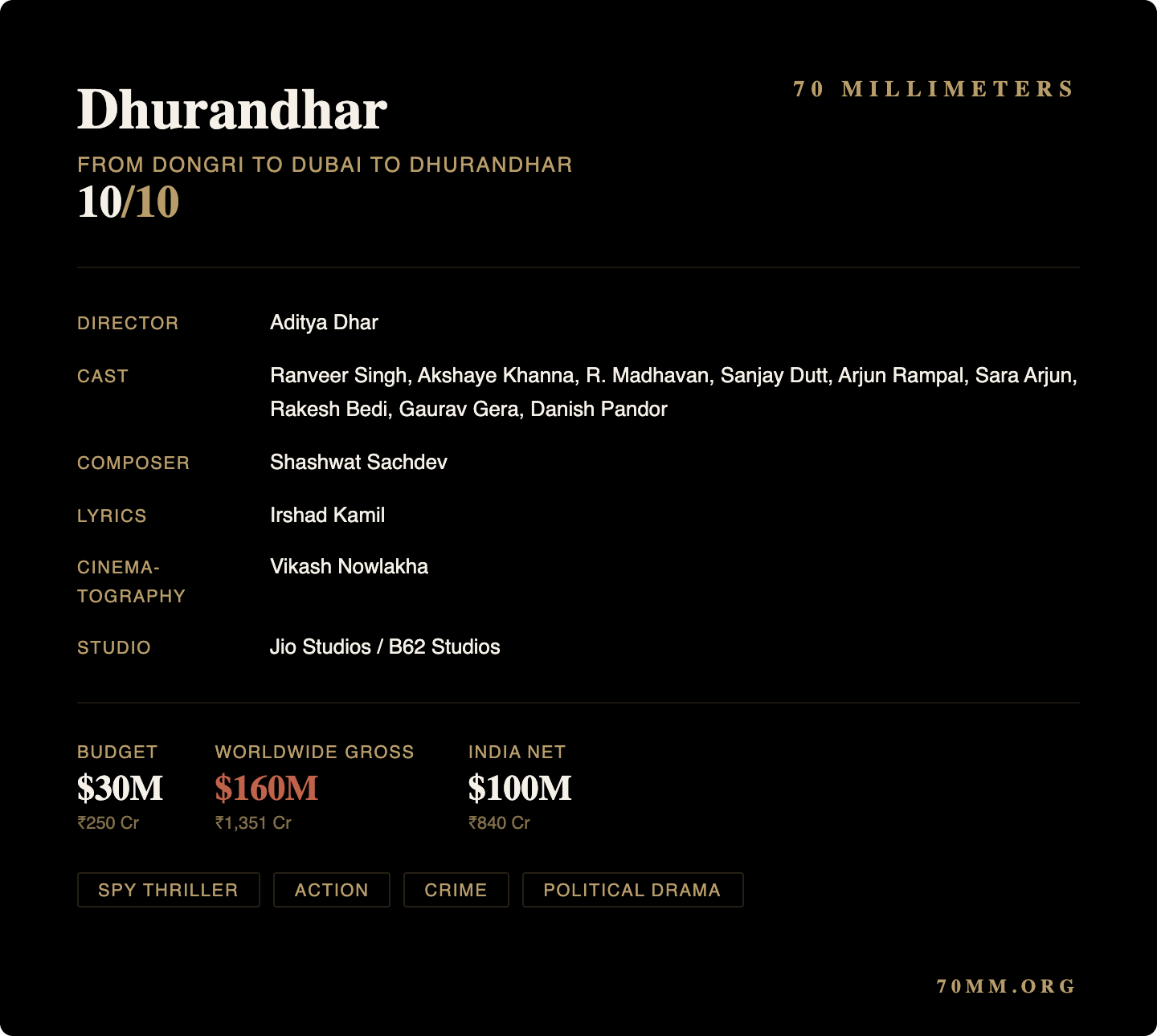 Dhurandhar is the best spy thriller India has ever produced, with the best ensemble Bollywood has assembled in years, with a strong soundtrack, and with a level of geopolitical detail that assumes its viewers are rational adults. How well does it do it? Nearly perfectly. The ending fight almost costs it. Almost. But three and a half hours of this kind of filmmaking earns the benefit of the doubt on one miscalculated sequence. Bollywood has finally arrived on the global stage. From Dongri to Dubai to Dhurandhar.