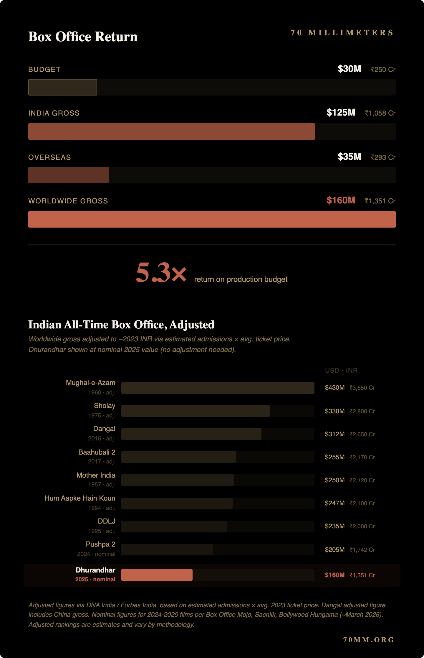 I haven’t seen Ne Zha 2 yet. But Dhurandhar feels like the same kind of moment for India that Ne Zha 2 represents for China. A domestic industry proving it can compete globally on craft, on scale, on ambition. Indian cinema has made great movies before. But most of those were art-house successes or dramas that played on cultural specificity. Dhurandhar is a ₹1,350 crore spy thriller that makes no concessions and has global relevance.