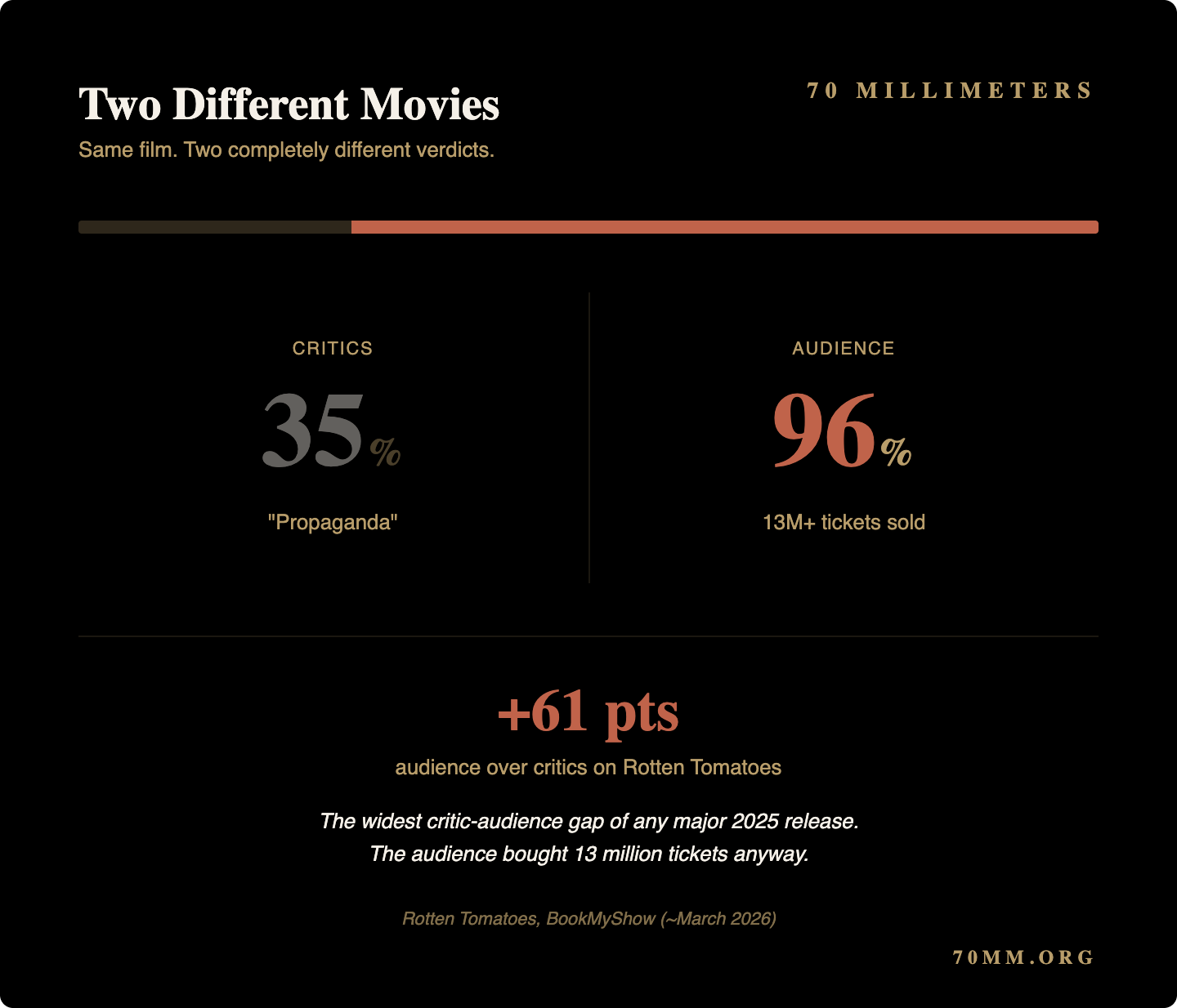 A 35% on Rotten Tomatoes from critics and a 96% from audiences. Rotten Tomatoes’ critics seem completely out of touch. I’ve rarely seen a split that bad. The critical establishment called it propaganda. The audience called it the movie they’d been waiting for.