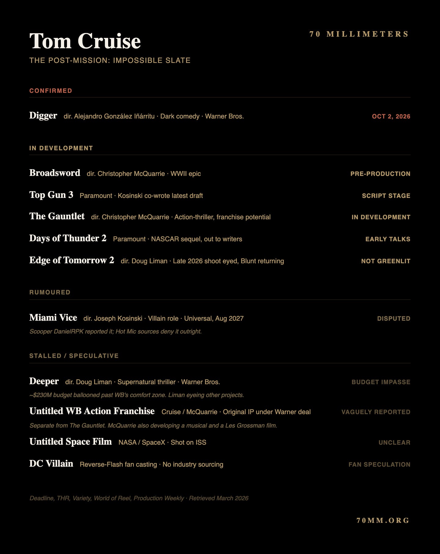 Then there’s the question of what happens after Digger. Cruise’s slate right now reads like a man trying to do everything at once, which is how he’s always operated, except now the clock is more visible. The full list is staggering: Digger with Iñárritu this October. Broadsword and The Gauntlet with McQuarrie whenever McQuarrie’s schedule allows. Top Gun 3 in development. Days of Thunder 2 in early development. Edge of Tomorrow 2, fast-tracked to fill the gap left by Deeper, the $275 million underwater thriller with Ana de Armas that Warner Bros. paused over budget concerns and that collapsed further when Cruise and de Armas broke up in October 2025. And then the projects that exist more as ideas than plans: a Les Grossman movie, a potential DC role, and a film that was supposed to be shot in actual outer space.